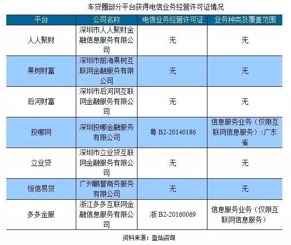 获得电信业务经营许可证方面,以车贷圈部分平台为例,有2家平台已获得ICP许可证,分别是投哪网和多多金服。不过,由于涉及到互联网金融服务的电信业务许可证可能需要重新换证,目前所有平台获得电信业务经营许可证或均不符合监管要求,关于电信业务经营许可证的办理还需等待具体细则下发。