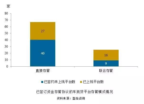 在与银行签订资金存管协议的92家车抵贷平台中,67家是与银行签订直接存管协议,25家与银行签订联合存管协议。并且其中有27家已与银行完成直接存管系统对接并上线,16家与银行完成联合存管系统对接并上线。总的来说车抵贷平台更青睐于银行直接存管模式。