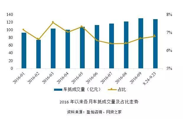 2016年1月至2016年9月底,P2P网贷行业成交量为14112.51亿元,其中车抵成交量为960.60亿元,占比为6.81%。从分月情况看,除了2月份受春节因素影响成交量有所下降,总体上车抵成交量呈上升趋势并于3月份顺利突破百亿大关后继续攀升,平均每月车抵成交量以4.27%的速度增长。另外,车抵成交量占比较为稳定,在6%-8%之间。《暂行办法》出台后的一个月,车抵成交量相对8月小幅增长,可见《暂行办法》对车抵业务成交量影响不大;同期,网贷成交量有小幅下降,影响车抵成交量占比略有上升。