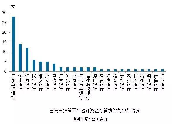 据盈灿咨询不完全统计,截至2016年9月底,已有民生银行、江西银行、徽商银行、恒丰银行和广东华兴银行等23家银行布局车抵贷平台资金存管业务,并共有92家正常运营车抵贷平台宣布与银行签订资金存管协议,其中真正与银行完成资金存管系统对接平台仅有43家,而同期,全国车抵贷平台正常运营数量为1136家,完成银行资金存管系统对接的平台数占比约为3.79%。可见目前仅有少数车抵贷平台与银行签约资金存管协议,完成银行资金存管系统对接的平台更是少之又少。