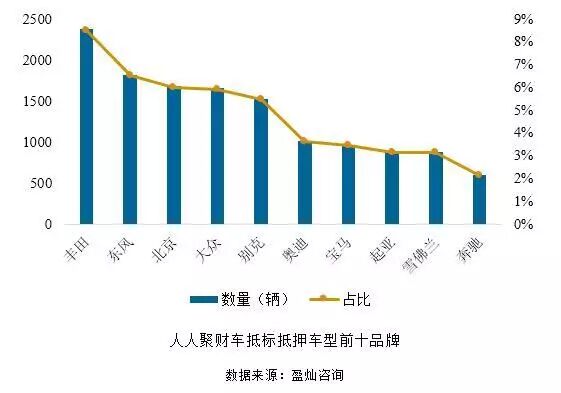 人人聚财定位于为个人抵押贷款业务P2P网贷平台,通过观测车抵标借款项目信息发现,绝大部分借款标是以个人自有车为抵押借款。超过百万的借款标较少,多是同一人以多辆高价车,如奥迪、雷克萨斯等车为抵押借款,影响借款余额较高。在可识别抵押车型的借款标中,人人聚财车抵业务排名前十的抵押车辆品牌分别是丰田、东风、北京、大众、别克、奥迪、宝马、起亚、雪佛兰和奔驰,较少以豪车抵押借款的情况。所以低价车抵押借款金额自然也相对较低,影响人人聚财单个借款标超过10万的占比仅为25.36%。