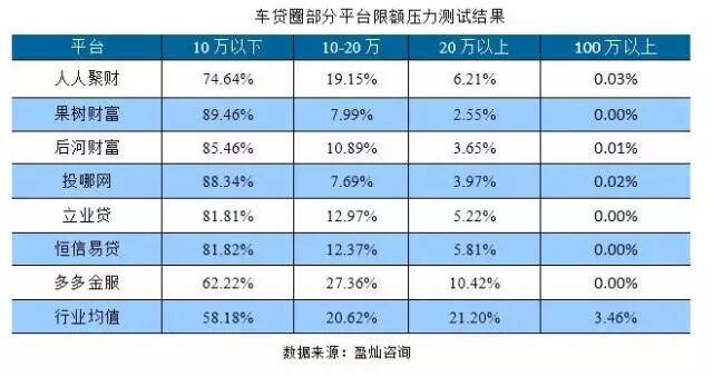 《暂行办法》规定,同一自然人在同一网络借贷信息中介机构平台的借款余额上限不超过人民币20万元;同一法人或其他组织在同一网络借贷信息中介机构平台的借款余额上限不超过人民币100万元;同一自然人在不同网络借贷信息中介机构平台借款总余额不超过人民币100万元;同一法人或其他组织在不同网络借贷信息中介机构平台借款总余额不超过人民币500万元。因车抵贷业务具有小额分散的特点,因此我们新增10万限额观测平台表现。