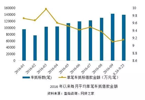 从单月车抵发标量[1]来看,2016年1-9月,车抵发标量基本上呈现逐月上升趋势。年初,车抵发标量为9.56万笔,9月份攀升至14.27万笔,平均每月发标量以5.13%的速度增长。发标量增速快于车抵成交量增速(4.27%),可见平均单笔车抵标成交额逐渐减少,从年初的近10万元/笔下降到9月份的9.10万元/笔。《暂行办法》后的一个月,车抵发标量高于8月份,说明《暂行办法》后市场上平台车抵标热度持续,但平均单笔车抵借款金额少于8月份,说明P2P网贷平台调整了一些大额车抵标的产品设计,以达合规要求。