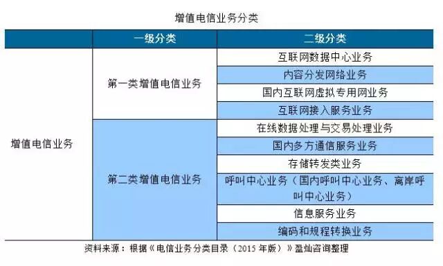 根据工业和信息化部2015年12月发布的《电信业务分类目录(2015年版)》,增值电信业务包括两类,第一类包括互联网数据中心业务、内容分发网络业务、国内互联网虚拟专用网业务和互联网接入服务业务四种业务,第二类包括在线数据处理与交易处理业务、国内多方通信服务业务、呼叫中心业务和信息服务等六种业务。