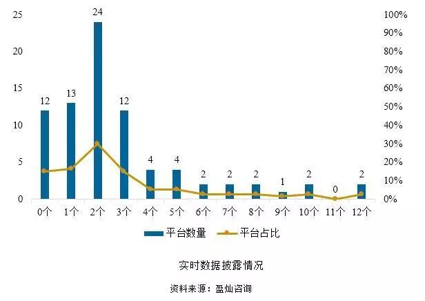 根据统计结果,车抵贷平台实时数据披露情况与行业整体水平基本一致。超过60%的平台实时数据披露在2项及以下,累计交易额、投资人数、借贷余额是平台披露较多的指标。而借款集中度、逾期坏账情况则披露较差。样本平台中,仅有2家平台实时披露了全部12项数据指标。