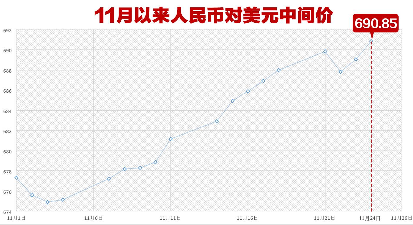 统计数据显示,11月4日至11月21日,人民币对美元汇率中间价遭遇12连跌,累计贬值1494个基点,贬值幅度达2.21%,虽然11月22日出现短暂反弹,但11月23日却再次下跌。