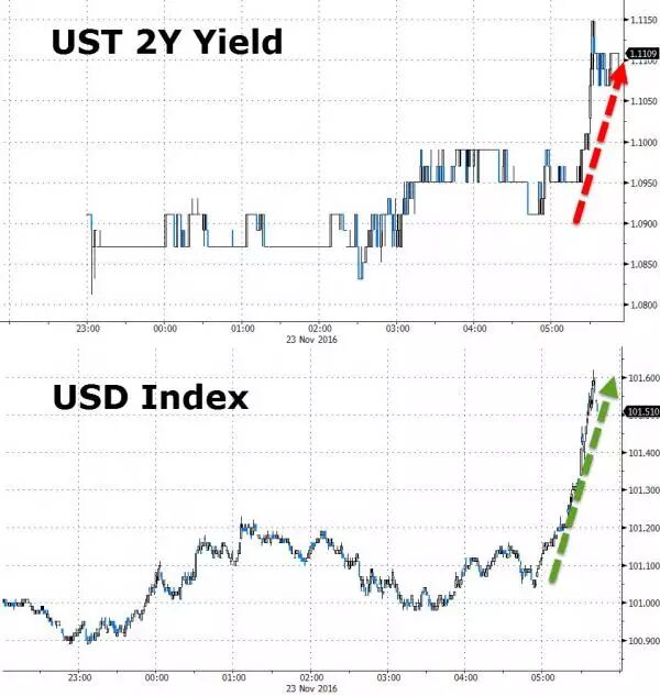 美国首席经济学家Paul Ashworth表示:“对于特朗普获选,股市不跌反涨主要是源于对明年大量财政刺激的预期,这进一步加强了下个月的加息预期。美联储主席耶伦在上周的国会作证中就没有刻意抑制这一期望。”