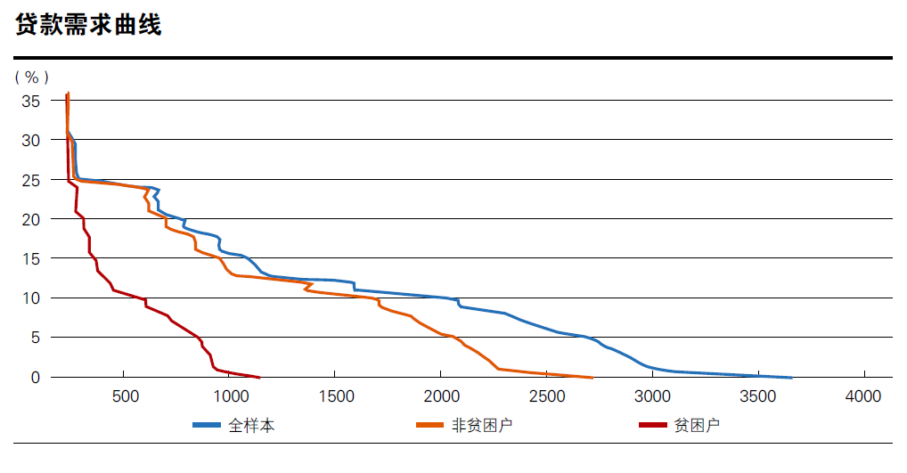 笔者试图利用问卷数据来解释贫困群体和非贫困群体在信贷需求方面的差异。需求曲线用来反应价格和需求数量之间的变化关系,价格越高,需求的数量越少,反之亦然。就信贷而言,利息就是资本的价格。因此,信贷需求曲线反应的是利率与信贷的关系,利息越高,对信贷的需求越少。根据调查数据,我们就可以描绘出贫困户和非贫困户的信贷需求曲线,分析他们之间的差异。