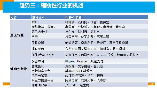 大家关注的焦点更多地集中在第三方支付、P2P、众筹、理财等互联网金融主流领域,其实,未来的机会可能更多地来自辅助性行业。