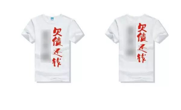 当澎湃新闻质疑打人如何不留证据时,对方表示,“拿书本垫,用锤子打,躲开监控,最好很多人一起陪你去,到派出所录口供的时候,大家都作证说你没打。”另外,他还向记者提供了印有“XXX欠债还钱”的T恤模板。