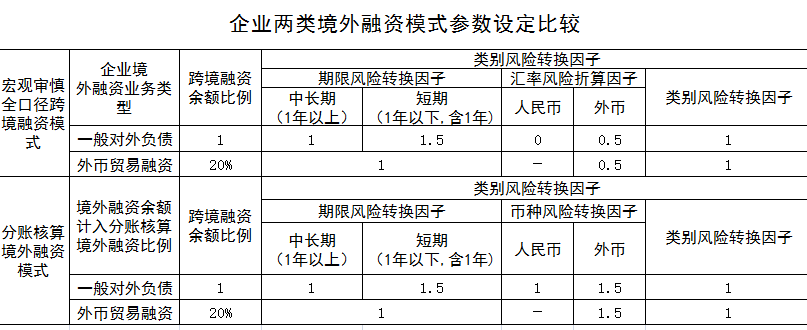 ▌全口径跨境融资宏观审慎管理模式。该模式较适合净资产规模较大的外商投资企业和全部中资企业采用。该模式下,中国人民银行和外汇局不实行外债事前审批,在与其资本和净资产挂钩的跨境融资上限内,企业可以根据境内外人民币及外币的资金成本来决定融资的方向,自主安排币别、金额及期限长短。对于中资企业而言,能够以较低的成本从境外获得流动资金,降低企业资金成本;对于经营状况良好外商投资企业而言,该模式赋予了企业更大的借债空间,并且让企业有了更多的自主选择权。全口径跨境融资政策通过引入风险转换因子、跨境融资杠杆率、宏观审慎调节等参数,实现了对市场跨境融资的逆周期调节,使市场跨境融资水平与宏观经济热度、整体偿债能力和国际收支状况相适应。在目前政策目标下,通过参数调节有效鼓励了企业借入中长期人民币外债。