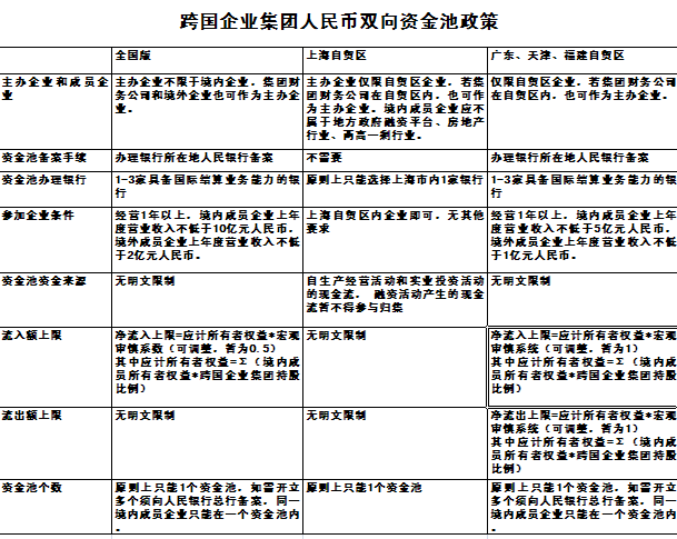 从归集资金的来源和准入成员企业的范围来看,目前全国版和天津、福建和广东自贸试验区的跨境双向人民币资金池政策中,有两点比上海自贸试验区政策更具优势:一是归集的现金流来源更广,全国版和天津、福建和广东自贸试验区没有要求归集的现金一定要来自于生产经营活动和实业投资活动,从而使融资资金进入资金池成为可能;二是企业所处行业更广泛,在对跨国企业集团境内成员企业的要求中,全国版和天津、福建和广东自贸试验区取消了对地方政府融资平台、房地产行业的限制。