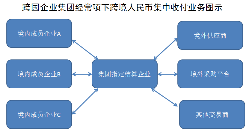 跨国公司经常项下跨境人民币集中收付业务,是指跨国公司对境内外成员企业经常项下所产生的的人民币进行集中收付款和轧差净额结算的业务,其与跨国公司跨境双向人民币资金池业务被合并称为跨国公司跨境人民币资金集中运营业务。其主要操作原理是打破集团成员企业单独跨境收付款的状况,统一由集团内部集中核算境内外交易,并将所有的跨境应收应付款轧差后,通过主办企业统一与集团外部的交易方进行结算。该业务最大的好处,是减少了成员企业经营资金的占用,有利于提高资金的使用效率,也大大节省了银行的手续费和基本交易费用。