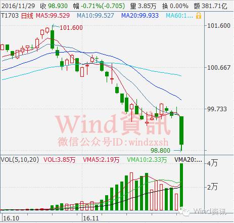 周二,国债期货品种全线收跌。10年期国债期货主力合约T1703收盘报98.93元,跌0.71%;盘中跌0.73%,创上市以来最大跌幅。
