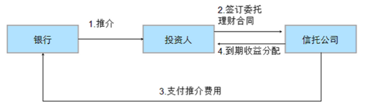 是指银行受信托公司的委托,向合格投资者推介集合资金信托计划的业务,项目来源可由银行提供也可由信托公司提供。推介成功后,信托公司向银行支付财务顾问费/推介手续费,同时投资人与信托公司直接签订相关合同,银行不承担信托到期不能兑付的风险。