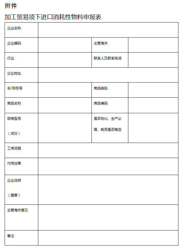 为规范、统一对加工贸易项下进口消耗性物料(以下简称“消耗性物料”)的管理,提高监管效能,现就有关事项公告如下: 一、本公告所称消耗性物料,是指加工贸易企业为加工出口成品而进口,且为加工出口成品所必需,直接用于生产过程,但又完全不物化于成品中的物料。物化是指料件通过物理或化学的方式存在于成品中并构成商品基本特性的转化过程。 二、海关对消耗性物料按照保税方式进行监管。加工贸易企业进口消耗性物料,不受企业性质、贸易方式(进料加工、来料加工)、是否单独申报进口的限制。 消耗性物料商品如因动态调整被增列入加工贸易禁止类商品目录的,按加工贸易禁止类商品进行管理,不实行保税监管。 消耗性物料或其制成品转为内销的,海关对消耗性物料依法征收税款并且加征缓税利息。消耗性物料属于进口许可证件管理的,企业在内销时应提交进口许可证件。 三、以下商品不按加工贸易消耗性物料以保税方式进行监管:加工贸易企业生产设备、工具的易损件,如钻头、钻嘴、砂轮、刀片、磨具等;易耗品,如机油、润滑油,印刷用的菲林、PS版等;检测物料,如检测纸、检测带、检测光盘、检测针等;劳保防护用品,如工作衣、帽、手套等;印制电路板用的干膜、生产高尔夫球头和飞机发动机叶片用模具所需进口的软金属、蜡、耐火材料等。 四、加工贸易项下进口料件同时符合以下条件的,不纳入消耗性物料管理,企业按照保税料件的相关规定办理有关手续: (一)料件在加工过程中通过物理变化或化学反应存在或转化到成品中; (二)料件存在或转化到成品中的量是保持成品性能不可缺少的组成成分,而非残留物。 五、企业申报保税进口的消耗性物料,应当在《加工贸易企业经营状况和生产能力证明》进口料件中予以列明。企业在办理手(账)册设立(变更)手续时,应当向主管海关提交《加工贸易项下进口消耗性物料申报表》(详见附件),申报内容应当完整。如海关需要,企业还应当提交以下补充材料: (一)消耗性物料的属性和用途说明;(二)消耗性物料在加工过程中的化学反应或物理变化原理、化学反应式、耗用量以及与成品的匹配关系等书面材料; (三)海关认为需要提交的其他证明文件和材料。 六、消耗性物料应当与相应加工生产过程的进口料件、出口成品纳入同一手(账)册管理。企业应在手(账)册设立(变更)环节按要求向海关申报。企业在申报消耗性物料时应当进行标识,在“商品名称”栏首字节起注明“[消]”(注:中括号为半角字符);在“单耗/净耗”栏目内如实申报耗用量。 消耗性物料应当与其他保税料件分项申报,不得归并。 七、消耗性物料的管理遵循如实申报、据实核销的原则。 企业应当结合生产实际核定耗用量并按加工贸易手(账)册有关规定要求的报核时间完成向海关报核。 海关认为有必要时可通过实地核查等方式对企业所申报数据进行核对、验证,企业应当积极配合并按海关要求提供相关证明材料。 企业对消耗性物料的后续处置参照《中华人民共和国海关关于加工贸易边角料、剩余料件、残次品、副产品和受灾保税货物的管理办法》(海关总署令第111号公布,海关总署令第218号修订)有关管理规定办理。 八、海关特殊监管区域内企业进口消耗性物料,实行保税监管。上述物料或其制成品销往境内区外,企业应当按规定缴纳税款并办理进口手续,涉及进口许可证件管理的应当提交有关证件。 九、本公告自2017年1月1日起施行。海关总署公告2011年第2号自本公告施行之日起停止执行。 特此公告。 附件:加工贸易项下进口消耗性物料申报表 海关总署 2016年11月24日