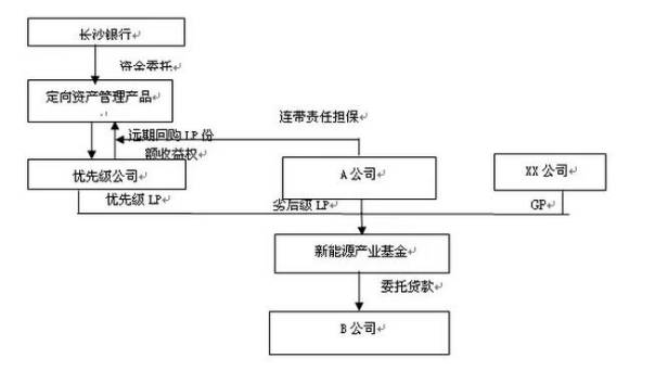 通过设立“新能源产业基金”的形式实现融资,基金总规模2.51亿元,其中长沙银行作为优先级出资2亿元(占比79.68%)、A公司作为劣后级连同基金管理公司(GP)出资0.51亿元(占比30.32%)。用于定向支持B公司新能源汽车生产流动资金周转。