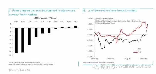 自从特朗普大选获胜以来,海外投资组合的资金流入已经急转直下,根据德意志银行的统计,仅在11月份有150亿美元资金撤离亚洲债券和股票市场,接近今年净流入资金的30%,其主要原因是美元升值以及特朗普可能推出一系列保护主义政策令新兴市场的经济增长前景变得更加黯淡。