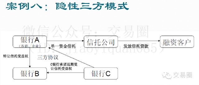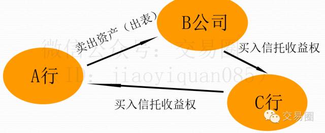 交易结构:A行与信托或证券、保险资产管理公司等第三方中介 公司签订委托合同,委托中介向目标公司发放贷款。同日,A行 (卖断行,即甲方)与B行(买入返售行,即乙方)和C行(买入 行,即丙方)签订三方协议,甲方向乙方转让该信托受益权,丙 方向乙方远期购买乙方受让的信托受益权。该行作为通道行配合 丙方将信贷资产腾挪出表。
