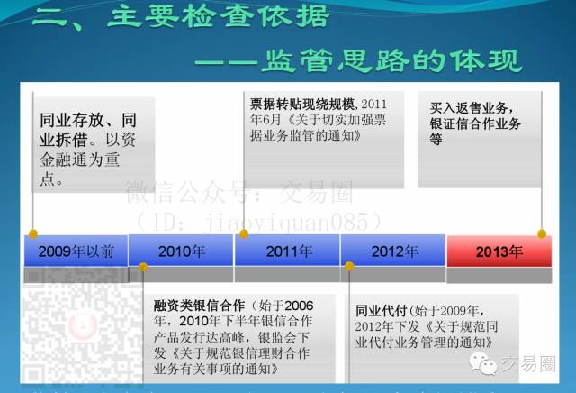 来源:交易圈商业银行同业业务检查概况主要内容一、同业业务基本概念 二、主要检查依据——监管思路的体现 三、检查要点、思路及典型案例同业