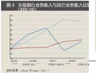 ——危机最严重的2008年,全球投资银行收入从2007年的3070亿美元降至1720亿美元;而同期银行GTB收入则从3040亿美元增加到3540亿美元。