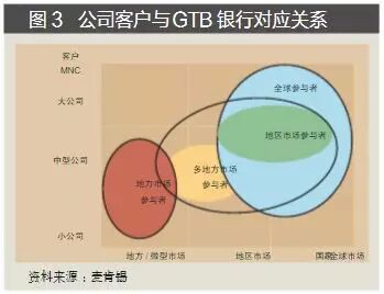 实际上GTB银行的层次也相对分明,根据客户/地域可分为服务于中小企业的地方GTB,服务于大公司、区域性MNC的区域GTB,服务于大公司、全球化MNC的全球GTB,以及主要围绕证券投资者提供专业交易处理服务的专业化GTB,如道富、纽约银行、梅隆等(见图3)。 为直接客户提供服务的可以是各层次银行,而服务于中间客户的通常是大银行,服务方式有代理、贴牌、外包等。例如,花旗GTB的目标客户是大型MNC及金融、政府机构。它基本上不直接服务中小公司,而是采取贴牌方式,利用花旗的设施和能力通过中小公司的关系银行提供间接服务。