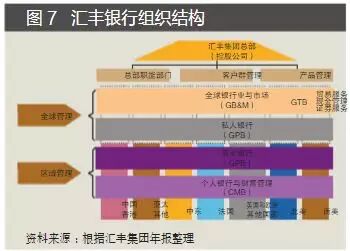 ——大公司/机构:全球银行业与市场GB&M。GTB是其中一个单元。GTB再划分为贸易服务、支付与现金管理、证券服务三条业务线。与商业银行板块中的交易业务相比,该板块更注重长期客户关系,更多定制化产品和针对特定客户的解决方案,更加全球化,并采用客户经理/产品经理合作的矩阵模式。 该板块的另一个单元涵盖市场融资、信贷、投资银行等。将GTB与融资、信贷、投资组合在一个板块之下,可更好地服务大公司/机构的综合需求。 ——高端个人:集团私人银行GPB。汇丰采用客户/地域矩阵结构,根据客户特征,对商业银行、个人金融服务采用区域为主的管理;而对包括GTB的公司投资银行与市场及私人银行则采取集团集中化管理(见图7)