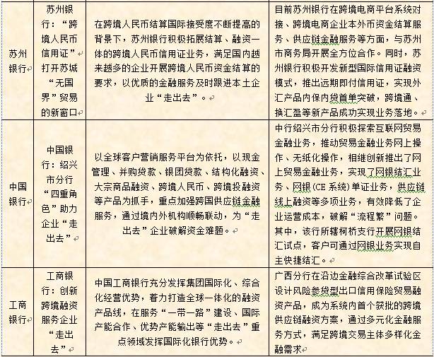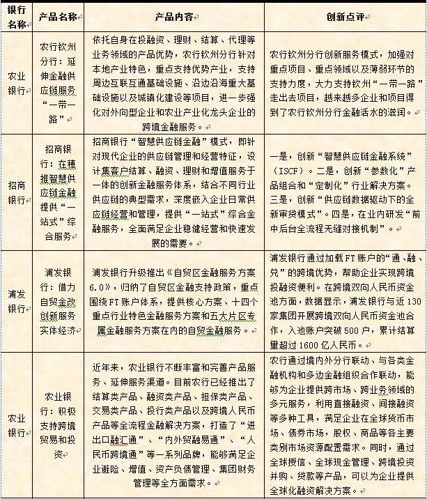 在近年来,农行钦州分行延伸金融供应链服务“一带一路”,招商银行在穗推智慧供应链金融提供“一站式”综合服务,工商银行创新跨境融资服务企业“走出去”等等。