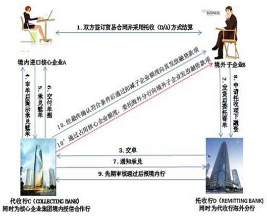 境内核心企业A拟向香港境外分公司B进口一批光学设备,双方在贸易合同中约定以跟单托收方式(D/A)结算。B企业托收行及结算行均为境内代收行C的香港分行D。由于境外分公司B在香港地区成立不久,未能获得D分行的独立授信,但其希望在核心企业A公司对单据承兑后提前获得应收款项,用于支持其后续业务经营。在知悉境内核心企业A已携境内外子公司(含B公司)一起获得C银行跨境集团式授信额度的基础上与当地监管部门进行了前期沟通,经确认同意后通过D分行向境内行C申请出口托收款融资。经C银行审核符合供应链融资管理下的放款条件,在规定的比例范围内向B企业发放了相关款项,并由D分行办理了入账。