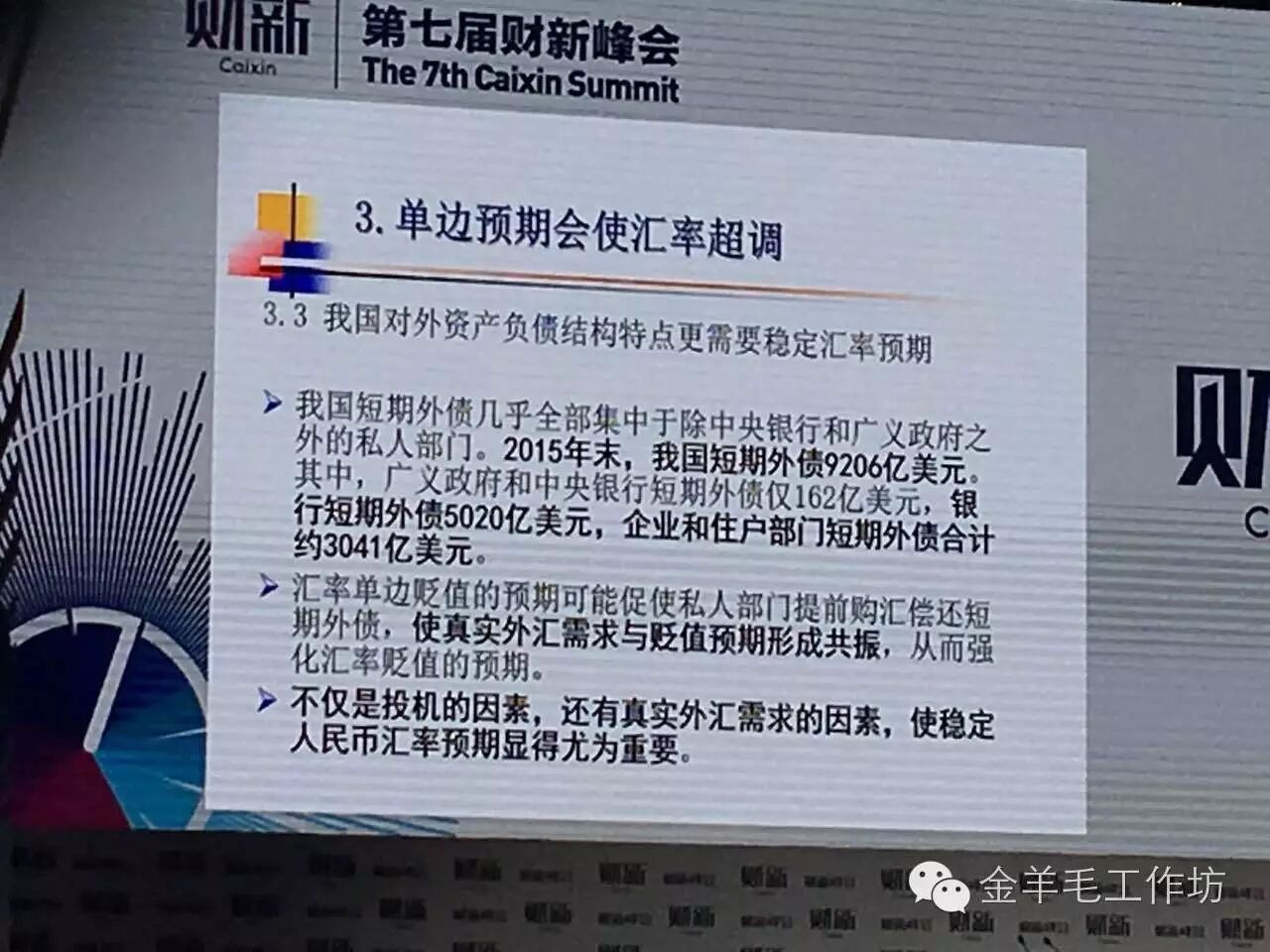 我们的短期债务是多少呢?是9000多亿,基本上都是集中在私人部门,不是中央银行,这部分短期外债会加强贬值的预期,如果三年要还的业务我不管它,贬值、增值谁知道呢?但是是三个月还的呢?两个月还的呢?如果预期贬值我想一切办法要购买,我想一切办法不结汇,所以我们国家特别需要稳定预期,两个方面,一个方面是每个国家都存在的投机因素,大家觉得要贬值就做空你,还有就是我们的资产负债表决定的,我们必须稳定预期,如果不稳定预期,3月份的钱2月份就没有了,6月份要还的钱,可能5月份就没有了,这个情况在有些国家会出现,比如说日本,日本的中央银行也好,私人部门也好,基本上都是净资产,我们特别需要稳定预期。
