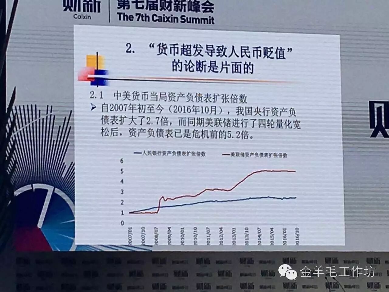 我说第二个问题,这个问题是我们在分析人民币会贬值的问题上机会所有人都认同的,我没有看到否定意见,但是我有不同意见,我把数字列出来给大家看一下。说是货币超发导致人民币贬值,所有人都这么认为货币太多了,但是人民币汇率是跟美元相比,不仅看人民币超发不超发,还要看美元超发不超发,如果美元也是超发的,你就没话说。请大家看这个PPT,从2007年到现在为止,10月份,央行的资产负债表扩张了多少?2.7倍,美国扩张了多少呢?5.2倍,几乎是我们的一倍,因为他进行了私人量化宽松,这都是实实在在的数据,网站上都有。