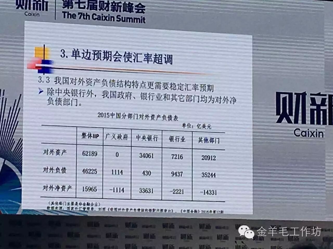 最后我讲一下这是国家资产负债表的特殊性,因为我们国家对外的资产负债表使得我们稳定预期的汇率特别特别重要,因为我们整个国家资产负债表是净负债,负债多少呢?是1.6万亿。我们中央银行是真正的净负债,2015年的时候是3.3万亿,现在是3万亿,但是我们其他部门,包括企业,这个企业部门里面,银行部门,还有广义政府我们都是净负债的,净负债是多少呢?大概是1.7到1.8万亿美金,所以整个国家的净资产是1.5万亿美金,所以这是非常麻烦的问题,这些债务你总是要还的,这一部分债务往往会加强我们自我预期的加强。