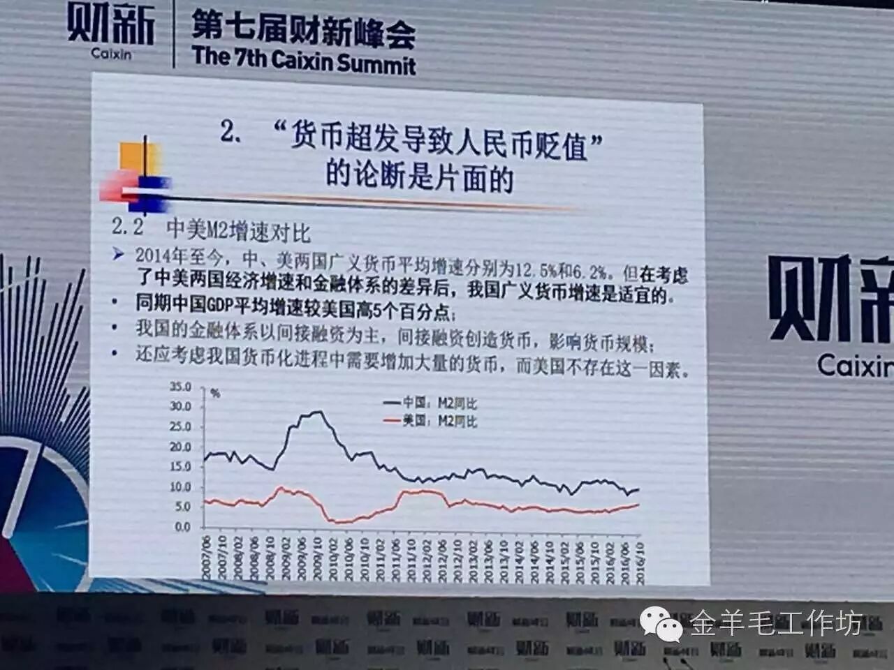 还有一个M2,我们比人家高了一点,我是从2014年开始比的,因为2014年耶伦上台了,我们比人家高,我们是12.5%,人家是6.2%,但是货币是用来交易的,还要看GDP的增速,我们的GDP同期比美国高了5个百分点。第二我们的金融体系是间接融资为主的,间接融资是要创造货币的,美国的资金是不少的,你们不能单单看我们国家的货币供应量高,因为直接融资股票都在流通,一样发生作用,还有很重要的一条就是我们的货币过程当中,很多东西都是不用货币的,所以我们的货币发生比较快,美国不存在这个问题。
