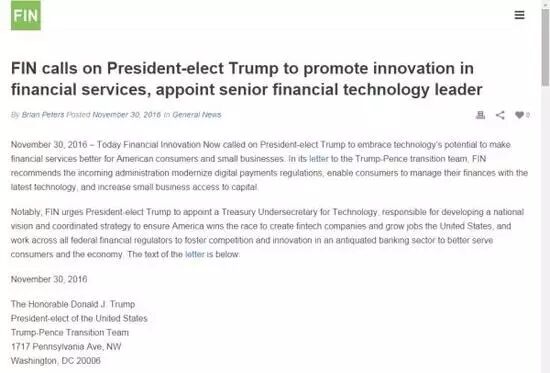 而在特朗普大选获胜之后,硅谷又急于向未来的总统示好。大选结束第5天,谷歌、Facebook、亚马逊、Uber、Twitter等40多家科技公司就给新总统发表了一份联名信,除了发出竞选胜利祝贺,他们还就科技领域政策应该考虑的问题提出了一系列建议。而FIN的这封公开信,除了提出金融科技领域的建议,还反复提到要与特朗普及其过渡团队合作,并强调这符合美国普通消费者和小微企业的利益。