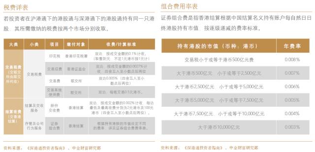 香港市场与内地在税费安排方面存在差异。具体来讲,投资者主要需支付交易税费、结算及交收服务费用、存管和公司行为服务费用等税费。香港结算为简化对内地市场的相关收费项目,对港股通持股统一收取证券组合费,以代替香港结算针对香港本地市场原收取的证券存管、代理人服务等多项费用。