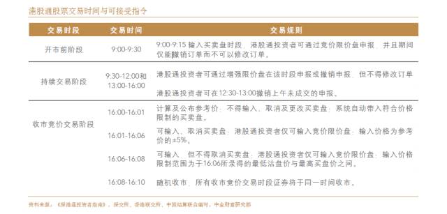 投资者交易港股通股票,9:00至9:15可接受竞价限价盘申报(集合竞价); 9:30-12:00及13:00-16:00可接受增强限价盘申报(持续交易时段,连续竞价);16:01开始接受竞价限价盘申报。