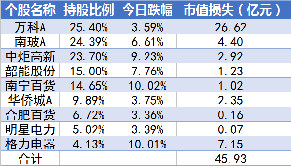 其中,宝能在9只个股上总计损失了45.93亿元,尤其是宝能旗下前海人寿最近大举杀入的格力,直接跌停!