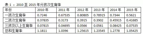 为了进一步分析近年的生育率,我们将2010至2015年的总和生育率按孩次分解。如表1所示,2014年总和生育率高于2013年;这主要是因为二孩和三孩次生育率上升,与2014年实施单独二孩的政策变化相符。而2015年的一孩、二孩和三孩次生育率都比2014年下降,下降幅度最大的是一孩生育率。除了实际的超低生育率、抽样误区以及其他宏观波动因素之外,我们认为2015年如此之低的生育率还可能部分归因于生育率的进度效应。