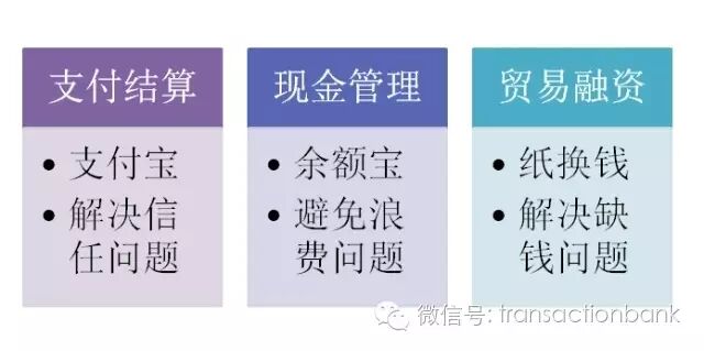 上世纪70年代德意志银行推出的交易银行业务,解决了贸易支付和融资各种障碍,提升银行为企业服务质量,加大了客户粘性,进而实现了利润增长的目的。为了解释交易银行业务和贸易融资的关系,本文先从贸易出发,其次介绍区块链作为底层技术与交易银行密不可分,最后阐述交易银行发展三大阶段。关键词:交易银行 贸易融资 支付结算 票据 信用证贸易双方不信任对方,银行就此推出“信用证”:贸易一定有一方买,一方卖,以进出口贸易为例,双方在异地,无法做到一手交钱一手交货,由于担心对方违约,双方都希望钱和货的交付以对自己最为有利的方式进行,即,卖方希望尽可能早的收到货款,最好是发出货的同一时间就收到货款,买方希望尽可能晚的付钱,最早是验货合格之后付款,最晚是试用货物一段时间并对其质量满意后再付款。这样双方就展开了博弈,体现在贸易合同中就是支付问题成为了谈判最多争议最大的部分。这时,银行挺身而出, 提出用银行自身的信用来解决买卖双方担心对方信用的问题,这就是银行的支付结算业务,最典型的产品是信用证。这里出现了“支付结算”和“信用证”两个专业词语,在解释他们之前,先介绍一个大家熟悉的支付宝。“信用证”可以理解为耗时更长的“支付宝”:为了解决买卖双方在异地,无法做到现场验货而带来的不安全感,进而淘宝平台以自己的信用作为中间桥梁推出“支付宝”,促进买卖交易的顺利进行。买卖双方选择在淘宝平台上交易的前提是信任淘宝,同样也信任代表淘宝的支付宝。使用支付宝的流程如下:购买货物的人将钱转入淘宝店主在支付宝上的账户;几秒种后淘宝店主就看到买方支付成功;购物的人在几天后收到货物并验货同意接收之后,在支付宝上确认收货,相当于给支付宝发命令说可以付款了;支付宝将货款转入淘宝店主的银行账号中。以进出口为例,买卖双方都不信任对方的信用,而相信银行的信用。使用信用证的流程如下:进口商将钱支付给银行,获得信用证,相当于购买货物的人在支付宝上付款;供货商收到信用证后打包发货,相当于淘宝店主看到买方“支付成功”的字样,这一过程在淘宝平台上使用支付宝只需要几秒钟,而进出口中需要7-10天,因为进口商需要将纸质的信用证邮寄给供货商,供货商再将信用证交给自己的银行;进口商收到货物并检验合格之后,给银行发出指令,可以转账了,相当于支付宝上的确认收货,供货商收到款项。这个过程在淘宝上需要几天,使用信用证需要数月时间。所以简单地说,信用证就是耗时更长的支付宝。支付结算就是买方把钱“支付”给银行,银行把钱“结算”给卖方的过程:信用证本质是支付结算的工具,支付结算就是指购买货物的人把钱支付给银行,银行把钱结算给提供货物的人的过程。贸易合同中,“使用信用证支付”是出现在“支付方式”一栏中的。它是一种支付结算工具,并列的有“电汇”,获得对方银行卡号直接转账的方式。随着金融市场的发展,信用证也成为了一种融资工具,但是需要强调的是信用证的本质是支付结算的工具。现金管理可以理解为更复杂的“余额宝”:买方在支付宝上支付的是全额,使用信用证时支付的是10%-20%的保证金,并在信用证到期时支付剩余款项。这笔钱在转给供货商之前,一直滞留在银行或支付宝上的,就出现了银行称为“现金管理”的业务,支付宝上称为“余额宝”的业务。贸易融资就是买卖双方到银行将有价值的“纸张”换成“钱”的过程:支付结算解决的是买卖双方不信任对方而引起的博弈,进而银行出面解决。现金管理解决的是滞留在银行的保证金的使用问题,不能闲置引起资金浪费。贸易融资解决的是买卖双方都希望占有资金的时间越早越好、越长越好而引起的博弈,进而银行推出贸易融资业务,即贸易双方可以使用有价值的单据到银行换成资金,买方可以用货物存放在仓库中的“仓储单”到银行换钱,卖方可以用“销售合同”、“信用证”、“发货单”、“船运单”到银行换钱。“贸易融资”发展到更大范围的“融资”就成为了“投资银行业务”:票据贴现是最典型的贸易融资。例如,甲拥有一张1年后到期的100元票据,支付给银行3元,现在就获得97元,不需要等一年后才获得100元,即,“贴”出去一小部分(3元),获得一大部分“现金”(97块钱),就是贴现。票据贴现存在一个问题即如果票据本身价值100,贴现最多可以获得100元,不可能101元,票据贴现暗含着可以融资的天花板就是票据的价值。如果需要获得更大规模的融资,就需要使用银行的投资银行业务。投资银行的核心业务包括发行股票和债券。公司通过各种方式说服投资者购买股票或债券,获得投资者的资金。“交易银行业务”就是将“支付结算、现金管理、贸易融资、投资银行”业务连成线:“交易银行业务”中客户的体验就是,我只需要将我的需求告知银行即可,银行内部支付结算、现金管理、贸易融资、投资银行部门自行协调。交易银行的内涵是集支付结算、现金管理、贸易融资、投资银行于一体,打破银行部门的限制,为客户量身定制服务的综合化业务:我们仍然用淘宝平台进行类比,客户购买商品后,可以在自己的账号内看到这笔交易的进展,是否已发货、货物所处城市或仓库、负责运送货物的人员等。在交易银行业务下,银行提供给客户的服务也能够