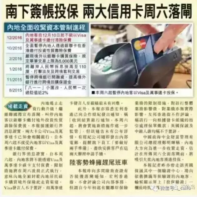 导读:香港银行及保险公司面向内地客户的渠道限制正在逐步升级。继银联国际叫停内地客以银联卡缴付后,香港银行界也传来消息,visa和万事达亦已知会相关银行,自本周六起将不再接受内地客户以visa和万事达卡缴付保费。