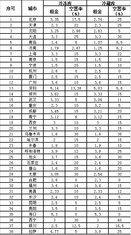 “仓库租金”和“仓库空置率”是国际上考核仓储业运营情况、评估物流业投资趋向的最重要的两项指数。全国38个物流节点城市是我国仓库等物流基础设施的集结地,是物流业发展的重点,对全国物流业的整体发展承载引领与促进作用。
