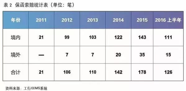 当前全球低迷的经济形势激发了市场主体的风险规避意识,放大了保函业务的市场需求,同时,也带来了保函索赔和保函纠纷的增长。近年来,工程保函、船舶保函领域的纠纷频出,给商业银行、承包商、船厂以及贸易商带来了新的挑战。保函索赔笔数也逐年增长,以工商银行的索赔统计为例(见表2),2012年和2015年收到索赔的笔数都有大幅增长,2016年形势更加严峻。商业银行需要关注保函索赔及纠纷,提升处理索赔及纠纷的专业能力。