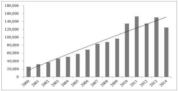 图9-2.2000-2014年新开工住宅面积及趋势