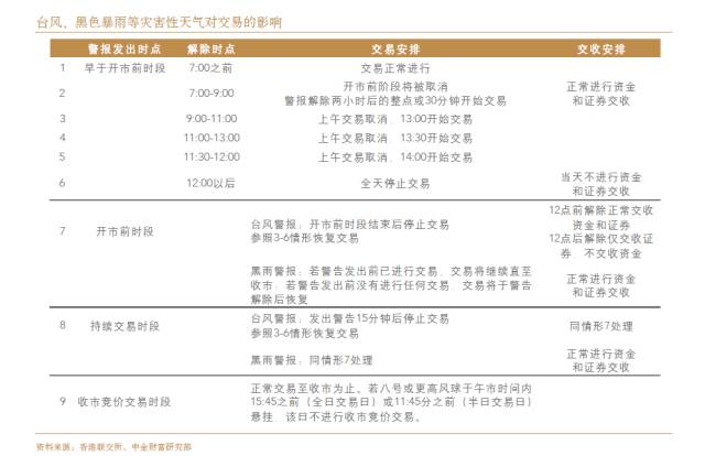 3、深市港股通标的包括哪些股票? 预计深市港股通可能包含约420支股票,总市值22.2万亿港币,数量/市值占香港市场的22%/84%。 “深市港股通”标的包括: (1)恒生综合大型股指数的成份股; (2)恒生综合中型股指数的成份股; (3)定期调整考察截止日前十二个月港股平均月末市值不低于港币亿元的恒生综合小型股指数的成份股; (4)A+H股上市公司。 不包括: (1)A股被深交所实施风险警示、被暂停上市或进入退市整理期的相应股; (2)A股在上交所风险警示板交易或被上交所暂停上市的A+H股公司的相应股; (3)在联交所以港币以外货币交易的股票。 4、深市港股通每天有多少额度? 深市港股通每日额度105亿元人民币。 深港通不设总额度限制,但为防范资金每日大进大出的跨境流动风险,深港通设置了每日额度的限制,深股通每日额度为130亿元人民币,港股通每日额度为105亿元人民币。 深港通下的港股通和沪港通下的港股通每日额度由深沪两家证券交易所分别控制,即均为105亿元人民币,互不影响、也不相互调剂。 港股通当日额度余额的计算公式为:当日额度余额=港股通每日额度-买入申报金额+卖出成交金额+被撤销和被联交所拒绝接受的买入申报金额+买入成交价低于申报价的差额。 5、个人炒港股账户余额需不低于50万元 中国证监会相关负责人此前表示,港股通投资者仅限于机构投资者及证券账户、资金账户余额合计不低于50万元的个人投资者。 交易结算规则 1、港股通交易日如何确定? 港股通将仅在深港两地均为交易日并且能够满足结算安排时开通。深港通开通当年的交易日安排将在开通前向市场公布。交易日公布指定网站:http://www.szse.cn/main/szhk/ (1) 两地的假期均不作为交易日和交收日。 (2) 由于香港采用“T+2”的证券和资金交收制度以及“T+1”的券商风控资金交收制度,因此如果境内放假香港不放假,为避免境内放假期间造成资金交收违约,境内放假前两天不作为港股通交易日。 (3) 香港市场的半天交易时间,港股通和香港保持一致,交易半天,但为非交收日。 “半日市”的交易交收安排: 如果圣诞节前一天(12月24日)、元旦前一天(12月31日)和农历新年前一天(农历腊月最后一天)为工作日,则香港市场上述日期为半日市:上午半天交易,且当日不是港股通交收日。而半日市(L日)、半日市前一交易日(L-1日)交易的交收均在L+2日完成。 举例:如果港股通投资者在12月23日(周一)买入一手港股,12月23日为港股通交易日,12月24日为港股通半日市,12月25日至12月28日为圣诞期间休假日(27日和28日为周末)。那么,其买入的该股票在12月24日(该日非周末)不进行交收,而是在12月30日(圣诞节假期后第二个港股通交收日)进行交收。 台风、黑色暴雨等灾害性天气的影响: 八号或以上的台风警告及黑色暴雨警告会影响到港交所的交易交收工作,具体情况请见下图。 港股通交易时间与可接受的指令类别: 投资者交易港股通股票,9:00至9:15可接受竞价限价盘申报(集合竞价); 9:30-12:00及13:00-16:00可接受增强限价盘申报(持续交易时段,连续竞价);16:01开始接受竞价限价盘申报。 投资者的港股通订单如果已经申报的,不得更改申报价格或数量,但在联交所允许撤销申报的时段内,未成交的申报可以撤销。撤单时间为9:00-9:15;9:30-12:00;12:30-16:00;16:01-16:06。 2、港股通交易相关税费 香港市场与内地在税费安排方面存在差异。具体来讲,投资者主要需支付交易税费、结算及交收服务费用、存管和公司行为服务费用等税费。香港结算为简化对内地市场的相关收费项目,对港股通持股统一收取证券组合费,以代替香港结算针对香港本地市场原收取的证券存管、代理人服务等多项费用。 中国结算依据相同标准,对每个持有港股的A股证券账户进行收取。 考虑券商佣金后,交易费用按成交金额算约0.2%-0.3%左右。 3、内地个人投资者差价所得,3年免征个人所得税 12月1日,财政部、国家税务总局、中国证监会12月1日发布《关于深港股票市场交易互联互通机制试点有关税收政策的通知》,其中,对内地个人投资者通过深港通投资香港联交所上市股票取得的转让差价所得,自2016年12月5日起至2019年12月4日止,暂免征收个人所得税。 对内地个人投资者通过深港通投资香港联交所上市H股取得的股息红利,H股公司应向中国证券登记结算有限责任公司(下称中国结算)提出申请,由中国结算向H股公司提供内地个人投资者名册,H股公司按照20%的税率代扣个人所得税。内地个人投资者通过深港通投资香港联交所上市的非H股取得的股息红利,由中国结算按照20%的税率代扣个人所得税。 对香港市场投资者(包括企业和个人)投资深交所上市A股取得的转让差价所得,暂免征收所得税;通过深港通买卖深交所上市A 股取得的差价收入,在营改增试点期间免征增值税。 4、港股通如何结算?什么是“T+2”制度? 内地投资者卖出股票:T日客户卖出股票在账户中冻结,同时卖出股票获得资金即时可用(但不可取)。T+2日中国结算正式划拨股票交给香港结算,香港结算也将客户应得资金交给中国结算。由于中国结算收到资金是在T+2日下午6点,因而客户资金在T+3可取。 内地投资者买入股票:T日客户买入股票立即可卖出(但并未划入账户),同时买入股票应付资金立即冻结,T+2日中国结算正式划拨资金给香港结算,此时资金正式从客户账户中划出,香港结算也将客户买入