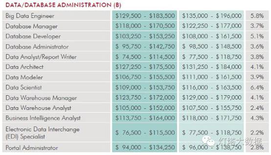 由于人才缺口过大,罗伯特·哈夫技术公司预测,到2017年数据科学家的平均薪资将增长6.5%,年薪在116,000美元到163,500美元之间(当然这是美国的标准,中国国内目前尚未统计)。同样,明年大数据工程师的薪资也将增长5.8%,在135,000美元到196,000美元之间。