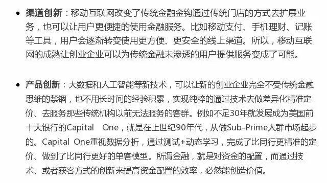 一级市场的投资周期长,更适合价值投资,而不是概念投资。传统金融机构已经十分庞大,创业公司必须通过创新、必须要与传统机构有所不同,才能创造价值、才值得投资人下注。目前创业公司可以从技术的角度去进行创新。 在中国,传统金融机构喜欢服务于大企业和优质的个人客户,因为他们的网点经营和获客模式决定了服务能力的局限性,所以只挑选利润最丰富的高端客户。对于占据中国人口数量主体的中低端用户,银行是暂时无法渗透到的。所以,新的机会恰恰将产生于这个银行目前无法服务的群体中。