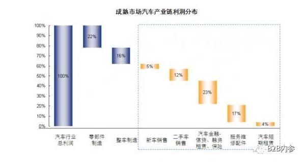下图来源于新华信的研究报告,是成熟市场汽车产业链利润分布情况,新车销售占比仅为5%,而汽车金融占比为23%。