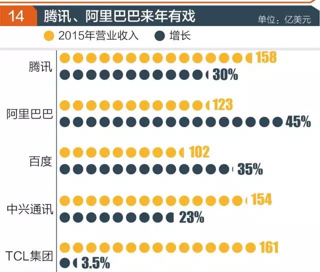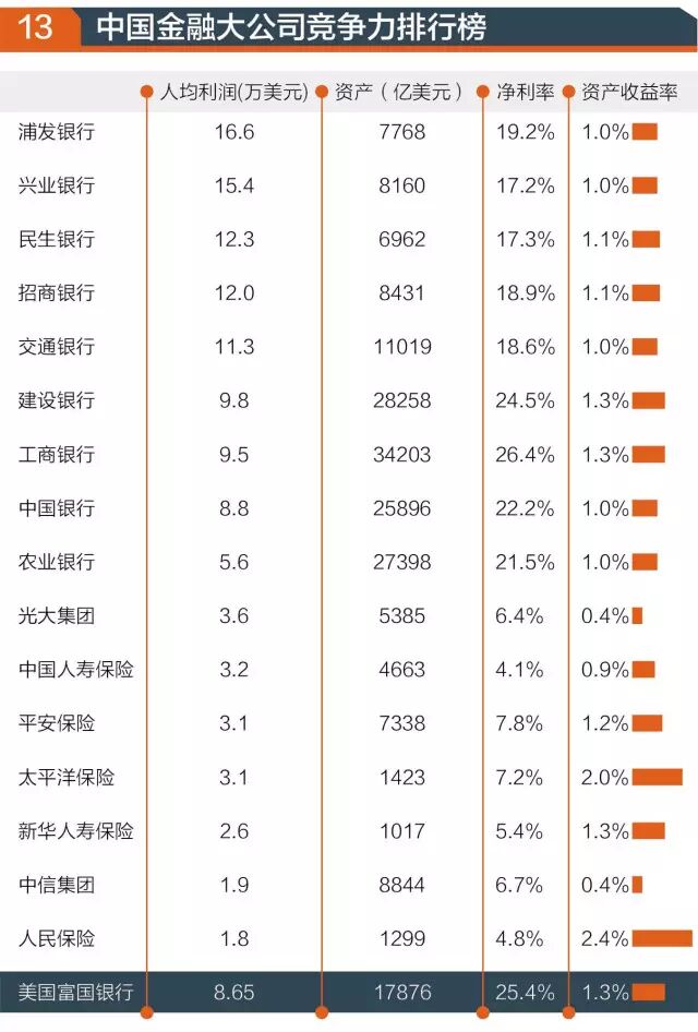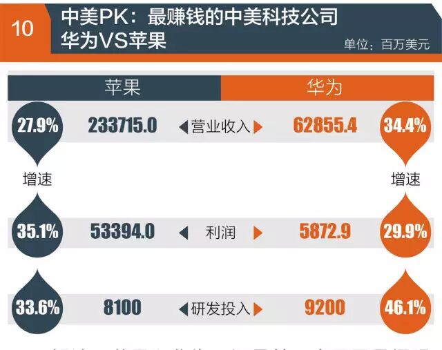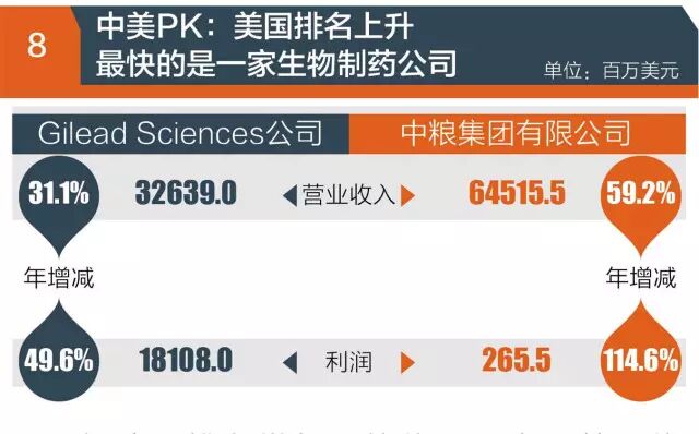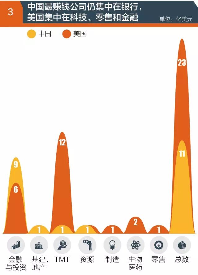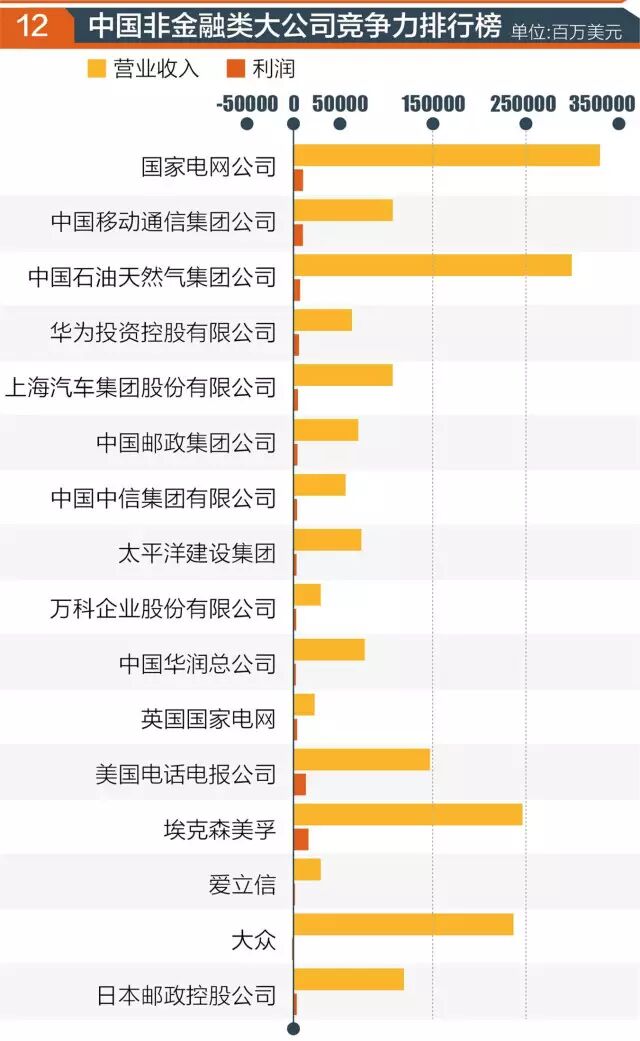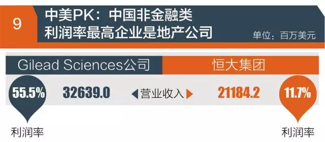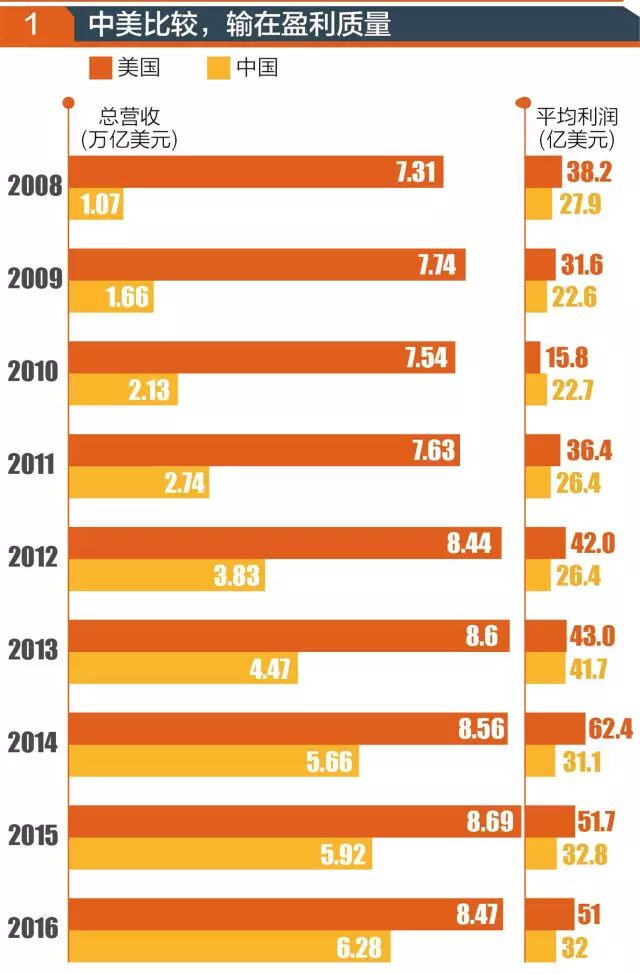 一、去掉银行,中国500强平均盈利远低于美国 解读: 中国的500强企业总营收也在2008年后出现了数倍的增长,2016年美国上榜企业134家,中国(含台湾、香港)达到110家,差距急剧缩小,但相比于美国而言,平均利润相差约40%。 解读: 选取的总样本为中国内地及香港地区的103家上榜企业,其中10家是银行,其总利润占据103家总利润的55%。除去银行的剩下93家企业,平均利润仅有15.9亿美元,相比全球上榜500强的平均利润29.6亿美元低了46%。 解读: 2016年世界500强最赚钱的50家公司榜单中,中美几乎瓜分了大半,其中,美国独占23家,包括苹果、摩根大通、伯克希尔-哈撒韦、富国银行、Gilead Sciences、威瑞森电信、花旗集团、Alphabet、埃克森美孚、美国银行、强生、沃尔玛、美国电话电报公司、IBM、微软、英特尔、房利美、甲骨文、通用汽车、思科、华特迪士尼、二十一世纪福克斯、康卡斯特电信; 中国内地有11家,包括工行、建行、农行、中国银行、交行、国家电网、中国移动、招行、中国平安、浦发银行、兴业银行。值得指出的是,美国的上榜企业主要分布在TMT领域,而中国最赚钱的企业则大半是银行。 解读: 最赚钱的10家公司,5家来自美国,4家来自中国,毫无意外,中国的4家正是工农中建国有四大银行。 二、中国资源类企业为全球500强亏损重灾区 解读: 2015年亏损公司前50名中,中国占了14席;2016年亏损公司前65名中,中国占了21席。亏损行业主要集中在煤炭石油化工钢铁等领域,其中,6家金属行业企业,包括有色金属和钢铁企业,共计亏损21亿美元。 解读: 对比2015年,有几家公司的排名降幅较大,其中中国航空油料排名从去年的321名降至484名。此外,武汉钢铁(集团)公司、鞍钢集团、中国电力投资集团、开滦集团、台塑石化股份、晋能集团、河南能源化工集团退出了500强榜单。退出的和排名降幅大的几乎均为资源型企业。在2015年国际大宗商品连连下跌和自身转型升级的双重压力下,中国的这类企业受到严重冲击。 三、结构升级诊断:中美仍有巨大鸿沟 解读: 中国的资源类企业、基建地产、银行等所占比重最大,这些领域中大多数是享受诸多行政垄断福利的国企;而美国则在生物医药、TMT和服务业拥有明显的优势。 两国的上榜制造企业数量相同,其中,中国有6家为汽车制造企业,共盈利114亿美元,而美国仅通用和福特利润就已达到171亿美元,这也某种程度反映出,在整合与影响全球价值链能力的维度上,中国还远在美国之后。 解读: 排名增长最快的公司中,美国的Gilead Sciences位列第二。2014年这家生物制药公司尚未进入世界500强榜单,2015年排第478名,2016年则上升至316名。 值得注意的是,Gilead Sciences的利润率高达55.5%。前述榜单也显示,此类以研发驱动为主的生物医药公司是美国500强的主要贡献力量之一。相比之下,中国的排名增长最快公司中粮集团,则是一家主营业务包括食品生产、地产开发等在内的“传统型企业”。 解读: 除去银行等各类金融机构,美中两国的利润率排名中,位列第一的分别是Gilead Sciences公司和恒大集团,美国的甲骨文、苹果、Alphabet、高通、英特尔等科技公司的利润率均超过了20%;Gilead Sciences、安进、强生、辉瑞制药等医药健康类公司也占据了较多高利润率公司的席位。而中国的非金融机构利润率排名最靠前的是恒大集团,其次是万科。 解读: 苹果和华为无疑是美、中两国最耀眼的科技企业明星,两家公司均在过去一年保持了高速增长,成为两国各自在世界500强榜单上最赚钱的科技公司,但相比之下,无论从营收、利润还是利润率的角度来看,华为目前仍落后了一大截,但在研发投入上,华为在2015年超过了苹果。 解读: 研发投入某种程度上是科技类公司抢占未来高地的一项先行指标。2015年,美国的科技企业中,英特尔位居研发投入第一,进入“无人区”的华为在这一项上已经追到了前列,与英特尔的差距并不大。但值得注意的是,美国的微软、谷歌、亚马逊等可与英特尔一起归属于研发投入“第一梯队”,相比之下,华为在中国的表现却有些“一枝独秀”。 四、中国大公司竞争力排行榜 解读: 在上榜企业中,去掉净利润亏损的,去掉今年在500强中的排名低于去年的,再去掉盈利模式上有优势的金融公司,我们可以得到一个在实体经济领域最高质量的中国500强企业名单; 这10家企业,广泛的分布在能源、石化、通信、汽车、运输、基建、房地产以及其他综合领域,集中的体现了中国企业的综合竞争能力。 解读: 中国内地有16家金融机构进入世界500强,其中以银行为主要代表,而与美国银行业最赚钱的富国银行相比,中国金融企业的盈利指标仍显露出一定优势,这种优势能否在利率市场之后继续保持? 以上数据来源:《财富》世界500强 五、展望2017世界500强:腾讯阿里敲门? 解读: 京东于今年进入世界500强,目前国内互联网巨头BAT三家均未进入500强,但正在逐步接近。此外,中国数家电子制造、家电行业的公司也在世界500强的门口徘徊。美的集团在今年冲入了500强榜单,而格力电器曾在2014年创下225亿美元的营收,十分接近当年237.2亿美元的入围门槛。