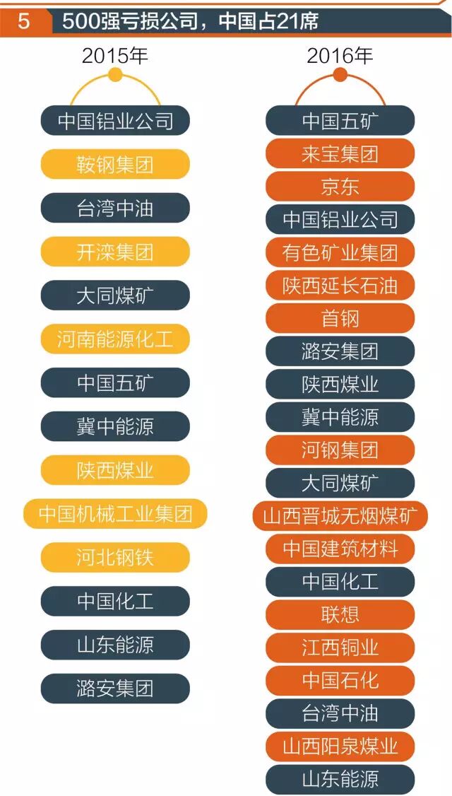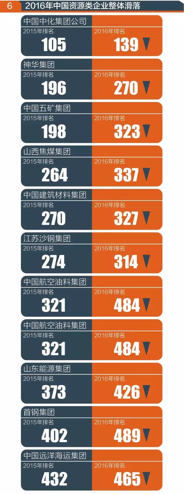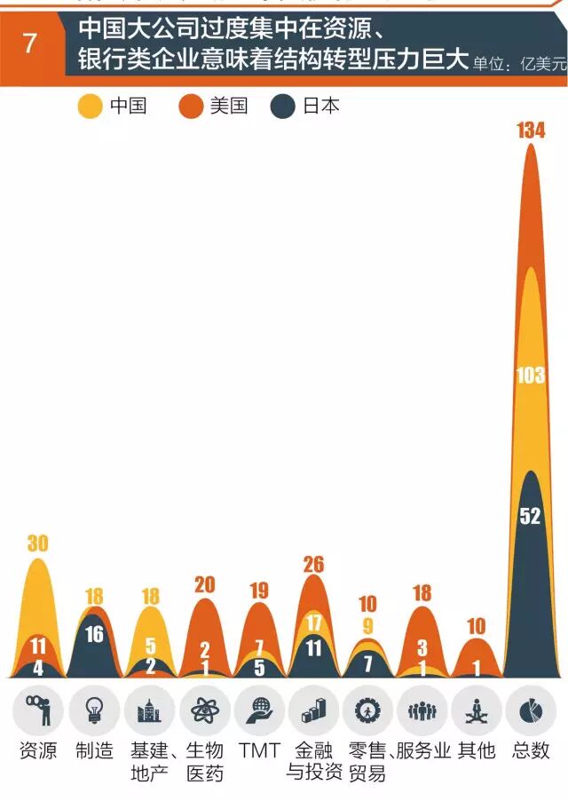 剖析这个巨大成就背后,事实的另一面是,相比于美国和日本,中国500强过于集中在基础性行业,包括能源、基建、金融等,在中国特色的经济制度下,垄断型央企是中国角逐世界500强的重要力量;与此同时,2016年世界500强65家亏损最严重的企业中,中国占据了21席,大多为资源型企业;此外,7家资源型企业今年退出榜单,10家排名大幅跌落。
