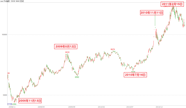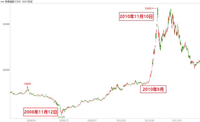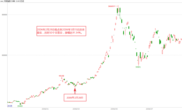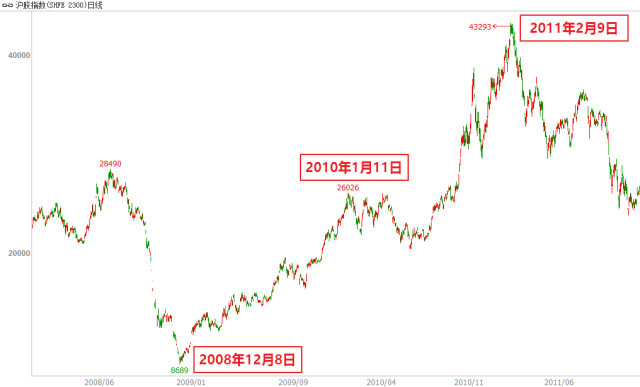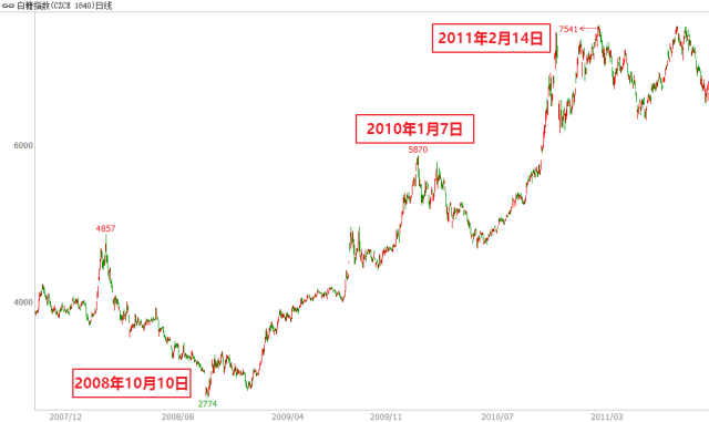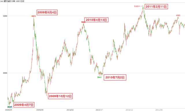 其中第一轮上涨自09年4月7日延续至当年8月4日高点逼近5000关口,涨幅达45%,历时83个交易日、120个自然日;第二轮上涨自2009年10月12日起至2010年4月13日,持续124个交易日、185个自然日,涨幅35%;最后一轮大涨自2010年7月2日起至2011年2月11日,持续147个交易日、225个自然日,涨幅31%。